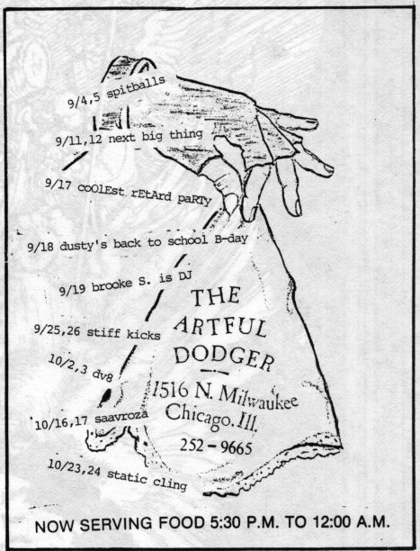 The Artful Dodger was a venue in Wicker Park in the early 80s. They seemed to play mostly local, smaller Chicago punk acts and worked with the folks at Coolest Retard zine. It was also a rather popular spot for punk DJs and dancing in front of their funky mural.