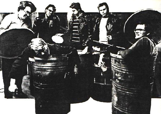 "The concert was held at a rented or possibly surreptitously borrowed industrial space temporarily named "Tutu's Placenta." Our anti-heroes stumbled uncertainly to the performance area, some dressed in combat helmets. In my memory they were all wearing Nazi gear and tinfoil masks. However a photo printed in the Gabba Gabba Gazette #8 (Summer 78) shows only the guitarist wearing a Reynolds Wrap facemask (Santiago perhaps trying vainly to conceal his identity) w/German-looking helmet and another member with a combat helmet of unidentifiable origin. Billy is wearing a jean jacket and t-shirt. Only three of the members were pictured. It still seems to me there was more than one tinfoil mask...but I may have been in only slightly better shape than the band. There was a bit of random guitar skronk, and then the band launched into "Jews Must Die". After what seemed an eternity but was probably a minute and a half the band departed the stage, followed by catcalls and possibly a few projectiles.