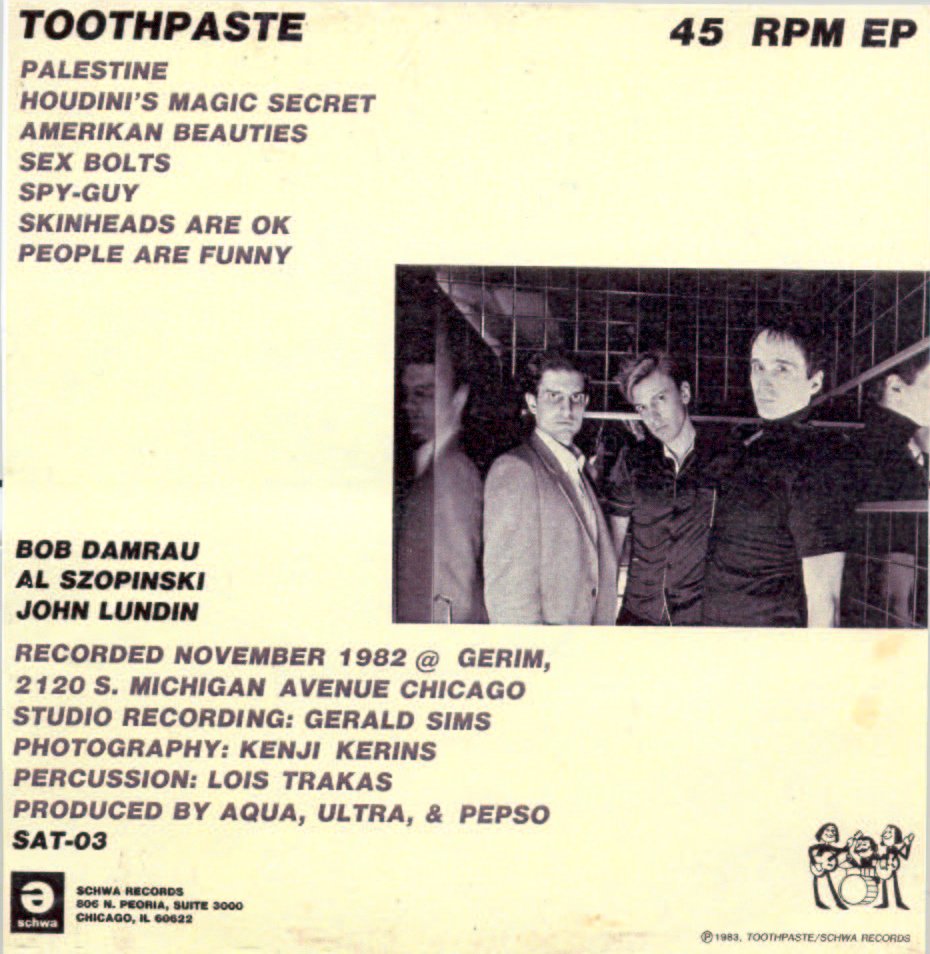 Toothpaste is an early 80s Chicago punk band that formed out of former members of Naked Raygun and The Wayouts. They released a 12" in 1983 recorded at 2120 S. Michigan Ave. (formerly Chess Records) and played around town until about 1985, with a number of lineup changes. Their record received favorable reviews and was recommended by Steve Albini, among others. Al Szopinski left the band for two years and former Naked Raygun members Camilo Gonzalez and Jim Colao took up the slack. Toothpaste took a more pop punk approach to the music while Naked Raygun, Strike Under and the Effigies pushed the more hardcore "Chicago Sound". Naked Raygun and Big Black member Santiago Durango wrote "Oh Yeah Come On" and Naked Raygun guitarist John Haggerty played sax on the studio recording of "Oh Yeah Come On". Toothpaste did a lot of studio recording with Iain Burgess and may release a compilation CD with fellow early Chicago punk bands Silver Abuse and the Way-Outs! in conjunction with their reunion show on December 29, 2007, at the Lucky Gator Loft.